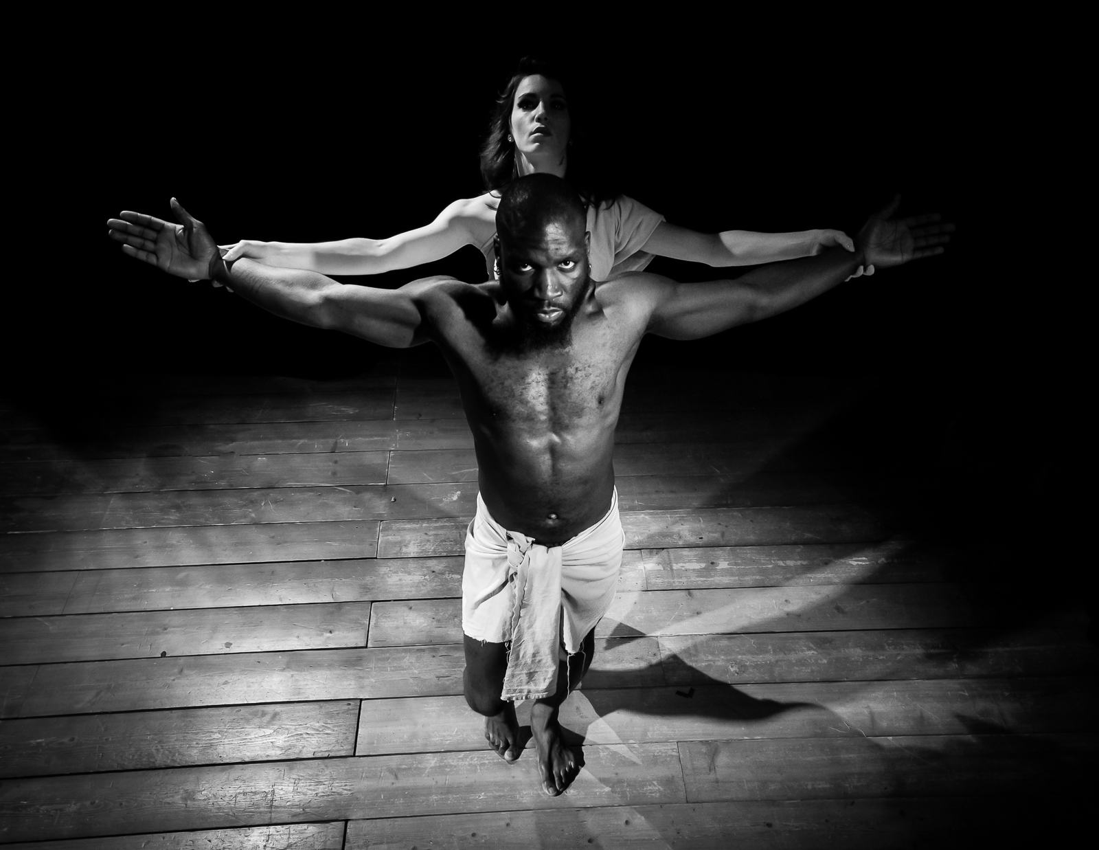 Dans ce cliché Lynoa qui selon l’oeuvre original fait succomber le Christ sous son poid a le visge tourné vers le sol, dans l’ombre et son corps est dans un équliibre précaire ce qui la rends tout de suite moins imposante et plus fragile que le serait la Croix. Ange lui nous envoie une regard profond et déterminé, la lumière éclaire la moitié de son visage et souligne sa musculature… on est loin du martyre peinant à se relever habituellement représenté. On ne doute pas du fait qu’Ange va se relever, toutefois l’ombre projetée par leur deux corps semble écraser Ange.